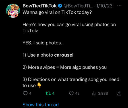 When I first started truly dialing into this opportunity and seeing how massive it was,Nobody was doing this on TikTok at the time.I dove head deep into it, 1 phone, 7 accounts posting everyday.Few accounts/Posts later, with the right music and seeing what was in demand.I finally went Viral, time over time.The best part? I got a DUMB amount of profile clicks because people wanted to see what other PFP's existed.So as you can imagine everyone is scrolling through 100+ PFP's, the algo is boosting me like crazy.Then they stumble across my clothing brand...I tested to see if anyone wanted it or if there was demand before even ordering anything.Made the Shopify store and sold hundreds of pieces.Some final notes:Don't be a dick and try to full on copy this strategy, it will not be as successful as when I first seized this and noticed an upcoming trend in carousels.Lastly, I spit a ton of alpha giving hints to potential trends like this very often in my discord.If this was helpful, definitely check out the discord. It's only $4, so if you don't like it you can leave.I do audits in there + have a course slowly releasing in parts there.
